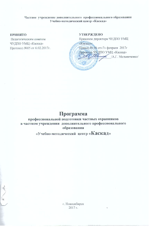 Частное учреждение дополнительного профессионального образования «Учебно-методический центр «Каскад», осуществляет профессиональную подготовку граждан профессии «частный охранник» на основании Закона Российской Федерации «О частной детективной и охранной деятельности в Российской Федерации», Устава частного образовательного учреждения, Лицензии на право осуществления образовательной деятельности от 20.04 2016 года.